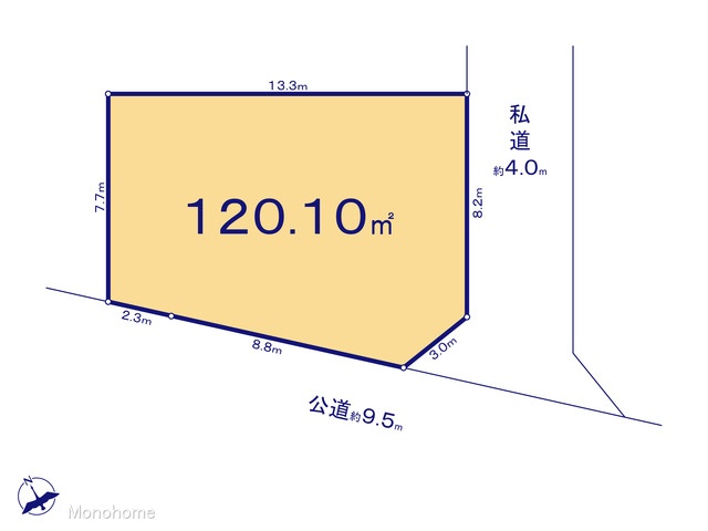 | 接道 | 南西側9.5M公道に接道 南東側4M私道に接道 |
